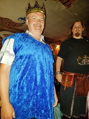 Vorher mußte der von der Gruppe ernannte König (Kompaniechef Uwe Klippert) seine Königin benennen (Silke Klippert) sowie einen Tischvogt (Volker Tennie), der die Regeln bei Tisch zu verkünden hatte und auf deren Einhaltung achten mußte. Eine besondere Aufgabe bekam noch unser Reiseleiter Karl-Heinz Timmerhoff zugeteilt, als „Armleuchter“ hatte er mit einer Kerze dem Tischvogt Licht zu spenden.